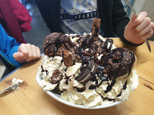If you want huge portions of the nicest cakes, go here!! Absolute bang for your buck! Warm scones with whipped cream and strawberries, delicious hot chocolate, and the BIGGEST death by chocolate you have ever seen!! I should have listened to the lady behind the counter, she warned me that a single portion to share would have been challenge enough but nooooo, "my boys are animals" I said to her 🤣 .... I didn't expect this thing to be the size of Mt Everest!! It should have come in trough with trowels!! It was amazing and thoroughly enjoyed by the boys even though they didn't manage to chomp it all (not for lack of trying!). The staff are so lovely, and the downstairs is dog friendly too if you have a four legged friend and the weather is a bit grim. Deffo eyed up the sandwiches and jacket potatoes for our next visit because they looked bloody...
