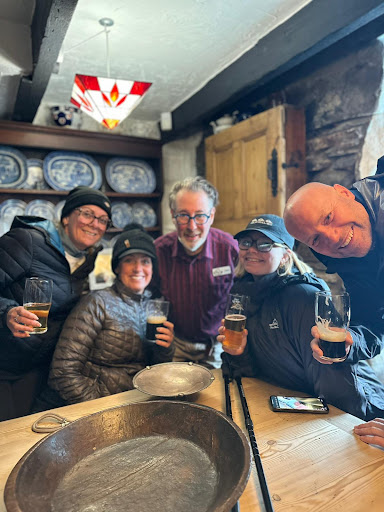 The roaring fire in the hearth was less a fire and more a sentient portal to a time when men wore cloaks unironically. Mark toasted his feet and declared himself Lord of the Socks. Our friend, who had conquered Snowdon despite its cruel incline, was crowned with a T-Shirt of valour by Steffan himself, a man who, we soon realised, was less of a man and more of an ancient guardian spirit of mid hike merriment.