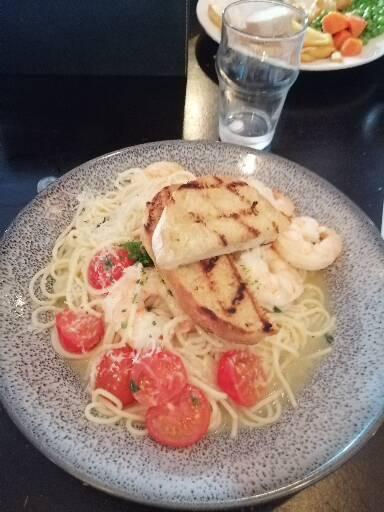 In a place which already holds quite a decent reputation, I was shocked to be presented with this- the "King Prawn Pasta", a total watery regret. Now, I'm fairly certain this was a one off, after seeing the other guests' dishes, none of which seemed to be surrounded by water. Food envy reached new levels that day, and the 2 stars this review has received is only for the sight and smell of the other dishes I could see being served- they all looked good. I'm still shocked at how one can get this so wrong, it is quite beyond belief. I sat there just staring at it for a while, knowing what watery disgrace I was about to tuck in to. I didn't have a lot of time left before my 2 young kids started to get impatient from sitting still, so I gave it a chance... The pasta was beyond white- it had been pre-cooked and stored in water, then reheated, in more water. The density really gave it away- I've had more bite in a bowl of custard. The sauce was like murky dish water, And some added water, just for good measure. Add 3 x halved cherry tomatoes, an inch of a really small transparent onion, briefly show them a frying pan with some more of that water, ensure no flavour is offered to the dish, and finally ASSUME the diner wants some cheese thrown on (wrong), and serve! Wow. I've worked and dined in plenty of restaurants in my time, but have never seen pasta served like this. I mashed the cherry tomatoes in to attempt adding a slight hint of flavour, with no success. I ate the 5 prawns, and gave up. After all, waiting for a different dish would only tempt fate with 2 young kids (as every parent knows).
