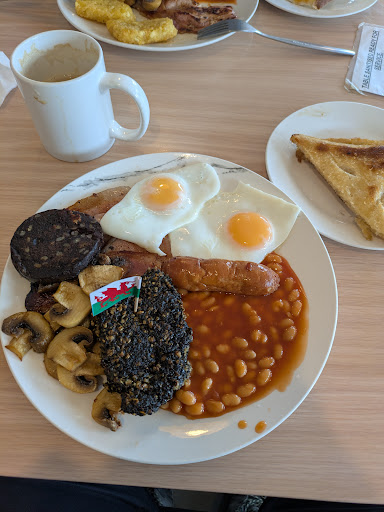 What a let down. After a long drive up through Wales we stopped off in Newtown to stretch our legs and have a cup of tea and something to eat. We saw this cafe when we parked the car and thought ideal. When we entered we started to look at a menu on one of the tables when we were approached by a member of staff who quite bluntly said, these tables are not in use use a table with the table mats on and we stopped cooking at 2pm. So seeing this was 3pm so we gathered that the 'all day breakfast' must finish at 2pm and also no hot food is available after 2pm. So a cup of tea later we left. Very poor customer service, rude staff member. Great advertisement...