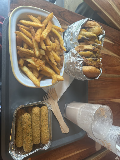 The menu is simple, burgers, chicken, fries, sides, and drinks. We had the two double smash cheese burger, 4 piecevchicken tenders, six mozzarella stick, and two lots of seasoned fries all freshly cooked and drinks, which came to just under £20 each, but you could go a lot cheaper and there was a lunchtime offer for £10 per person.