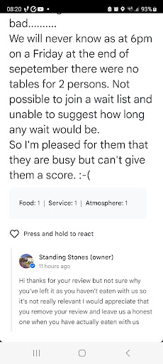 So reevaluate the score with some explanation for the passive aggressive manager in denial. First off I've scored the food as 1 as we didn't eat because there was no option to. If you went to hire a car and the rental place said 'sorry no cars' you wouldn't leave them a 5 star review. Hence you get a one. Service 3 as the staff were pleasant but can only do what they do Atmosphere 3 as it looked tidy and was welcoming.