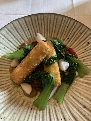 Received a welcome snack of fried halloumi with a salty garlic dip. The amuse Boucher was cauliflower and celeriac soup. This was smooth, flavoyrsome and amazing. Also received foccacia with oil/balsamic dip.