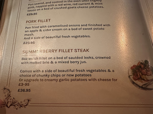 Read moreThe location styling and ambiance of the restaurant is fantastic, it’s just a shame the food did not meet the same standards. We skipped starters and went straight to the main menu. We had “Oceans Muscles” & “Summerberry Fillet Steak”. The muscles were ok, a good sized portion that were tasty and neatly delivered. The sauce was nice albeit a little thick. The menu advertised the dish would come with “chunky chips & bread for Dunking,” the bread was forgotten. A side of vegetables ordered alongside this dish were also forgotten. The Summeryberry Fillet Steak is one of the more expensive items on the menu. It was really disappointing and not worth the £36.95. The meat itself was ok, a good size and well cooked. The garnish looked really sad and wilted, the Brie that is served on top of the steak was thin & bland, but worst of all was the summer fruits. They looked, felt and tasted like they had just been defrosted and placed around the plate to make it look fancy and colourful. It made the whole dish taste really sharp. The sautéed leek was ok. Overall the ingredients just didn’t compliment one another. Ordered alongside this was the Baytrees “famous” garlic cheesy new potato’s. Microwaved garlic butter and melted cheese stuck under a grill for a minute or two? It was really hot! Not sure how, but it was watery and not something a good restaurant would want to be famous for. Overall we were so disappointed we skipped desert, settled up having had to challenge the missing items on the bill and left. It’s not somewhere we...