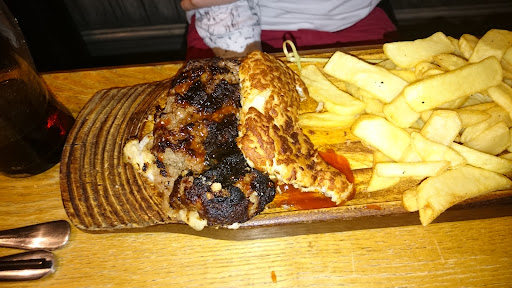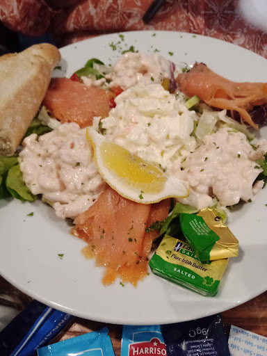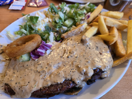 I will never go here again! Awful place, dark interior, music so loud that a quiet meal & a pleasant talk was completely out of the question. Very, very short staffed. No waitress service, order at the bar & get your own cutlery & condiments, also, the tables were lefted with dirty dishes on them. Eventually a very miserable looking young man came out to clear tables. We waited over half an hour for our Fish and chips, which were warm to cold, so I assume the food was sat waiting somewhere & it was NOT worth the wait. On the menu it says the fish is done in a homemade beer batter. I don't know whos home it was made in but it was not here, it was not fresh & dark brown, swimming in fat, completely over cooked. Served with onion salad garnish & coleslaw! Why? Trying to be modern or something & failing completely, it was horrible, Fish & chips should be served with garden peas or mushy peas for a reason, they taste good together! Coleslaw/onion salad DON'T. No choice of white or brown bread, it was just dumped on the table, one plate between two, & as I can't eat brown bread a waste of money. I would of said something but these were not the type of staff you could approach. No friendly welcome, no how was your meal, no can I get your anything else. It felt like the parents had left the very disinterested children in charge. We couldn't wait to leave. I don't how many staff they have but we didn't see many. Then if that wasn't bad enough the ladies loo was disgusting, dirty & in urgent need of repair or replacement. No loo roll was bad, but a toilet that moves is frightening. I had to tell two foreign ladys not to use the loo until I got more loo roll. As I came out the young man was being asked for loo roll by another lady but he just got it & left it in the kitchen until he saw another member of staff, a lady, I mean he might not want to enter a lady's WC or perhaps they told him not to but he could have gone & found her! Honestly everything felt like too much trouble in there, a really uncomfortable feeling, definitely not recommended. Also not the cheapest place. If you want good food, at a good price, in a clean, friendly environment go somewhere else. Oh yes & I had to move chairs, the first one...