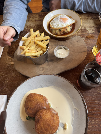 The place was exceptionally busy and I think the serving staff coped well. The menu advertised a starter with a soft poached egg, it is not and I saw other people with it the same, one customer sent hers back. It was well-cooked and I think it must be those pre-prepared poached eggs. That's down to JW Lees who run these places. Personally, I wouldn't offer a dish with a soft poached egg if it can't be delivered.The prawn & avocado starter was good. Main course was good but my steak was a little bloody but I didn't send it back as it was so busy. Always hard to get steaks spot on. It tasted good though and was tender. Dessert was the star for both of us. The crumble came with custard and ice-cream and the pineapple fritters were generous.