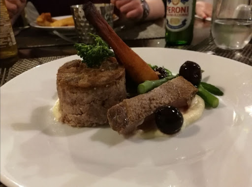Starter of roasted garlic, tomato and basil soup was very good with some crusty bread and real, soft butter with it. Perfect appetiser on a cold day.