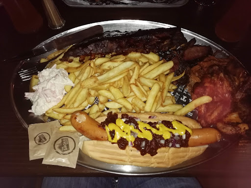 I've been all through the south in the US. I happen to be the head cook and own a BBQ restaurant in the US. BBQ is what I do to pay the bills for nearly 20 years. Let's get to it. We ordered the large platter with ribs, brisket, pork, wings, a cheeseburger, fries and slaw. There was a huge amount of fries in the middle of the tray. The Slaw was not bad but, way over dressed. The wings (we ordered the honey mustard) were very bland with no sauce and WAY over cooked. They were crunchy and dry. The ribs should have been trimmed better but not really a complaint as much as an observation. They were over cooked as the bones easily pulled right out of the meat. Rib meat should stay on the bone but, should release with a little pull. Anyone can make meat fall off the bone. It's called over cooking. The flavor was ok. Not great but, not bad. Middle of the road. Now for the best and worst. The worst by far was the brisket. Look, brisket is hard to do right. It takes years to get it down and even then, it's still not easy. This brisket was so dry, it was hard to eat. In fact, we didn't. After a few trys, it was pushed to the side. Also, someone in the kitchen needs to learn how to properly cut brisket. Our slices were way too thick and they were with the grain. When cut like this, the meat is stringy. Brisket should always be cut against the grain. Now onto the best. The pulled pork was by far the best meat on the platter but even then, it would only be considered so-so back home. It had a decent smoke signature and the flavor profile wasn't bad at all but, again it tasted a bit dry and just off the mark.