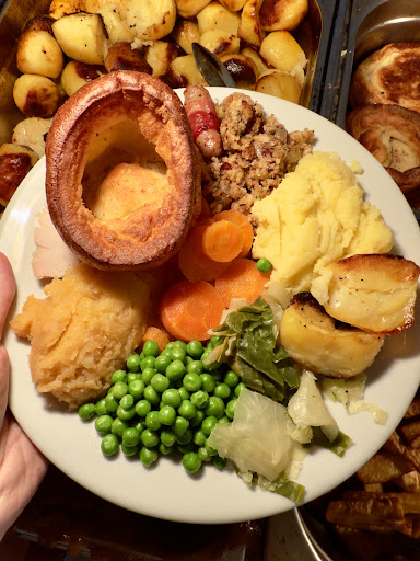 The veg options were boiled potatoes, roast potatoes, roast parsnips, mushy peas, cabbage, cauliflower and carrots that was it.