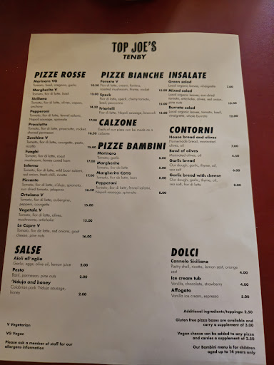 Read moreFirst things first, these are brilliant pizzas, really great. The staff are lovely and the place itself is really welcoming, but where this place is knocking the socks off almost EVERY other place in Tenby is their ability to deal with allergies. Yes, lots of places in Tenby say they can do gluten free, but my friend's allergy is serious, so we always phone in advance to find out exactly what places mean by 'gluten free'. Every place we spoke to was just a bit too relaxed about the whole thing ('I'm sure we can do something', 'come on in and we'll see what we can do' sort of thing) which usually ends up with my friend eating a plain salad or having a serious allergic reaction. Top Joe's were - quite frankly - the only place out of about 20 we spoke to that really left me with the confidence that we could eat there. We were right, the food - both gluten free and non GF was lovely and not one hint of a reaction from my friend. If you have food allergies, eat here. In fact, even if you don't have food allergies, eat...