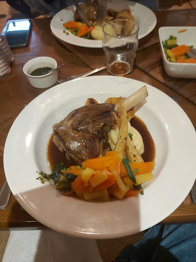Next came the wonderful Welsh lamb shank, big, cooked to tender perfection in a delicious gravy, with incredibly tasty roast potatoes (crisp and seasoned on the outside while fluffy inside), creamy mash, and a mix of carrots/peas/root veg, all cooked to fresh tasting perfection. A rustic dish prepared with a real touch of class, using local ingredients... Absolutely outstanding!