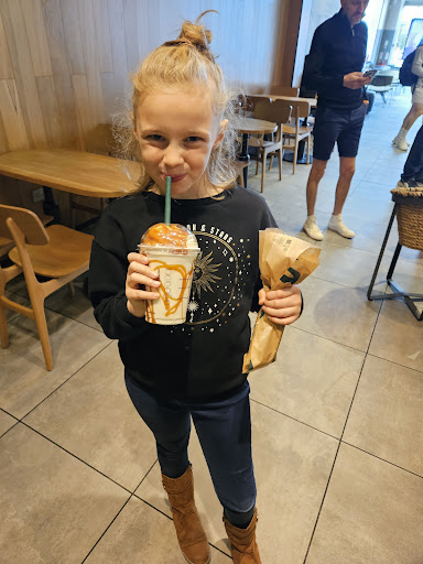 Read moreSo my daughter aged 9 is starting to recognise the cool names shall we say 😳 Starbucks being just one. To me it was a very over priced, crowded, unfriendly staff experience. I get it's fast paced but it was herrendoous in there they wasn't Overly busy with customers there were lots of staff in each others way more. Stressed me out just watching them!! So my daughter had a chocolate pretzel frappucino thing yes was delicious, myself a latte which I had to put 2 sugars in & I don't tend to have sugar in this choice of drink it was so strong from there. & my husband Americano he said it was enjoyable but he's a coffee drinker anyway. I think the smell of coffee shops are inviting 😋 The nice part of counter where the cakes/ biscuits are all looked edible yumyum but the prices were ridiculous. Were just a basic family wanting to enjoy food & drink but not with extortionate price tags. My daughter was happy but she don't understand fully the prices 😕 it's defo once in a...