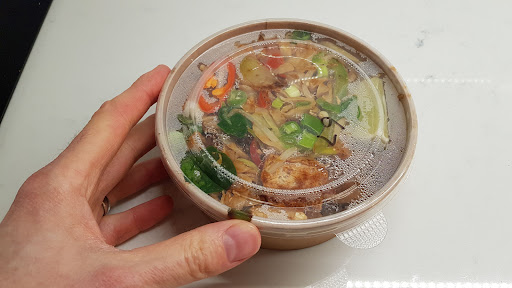 Food was hot and well cooked and presented in cardboard dishes, so good for the...