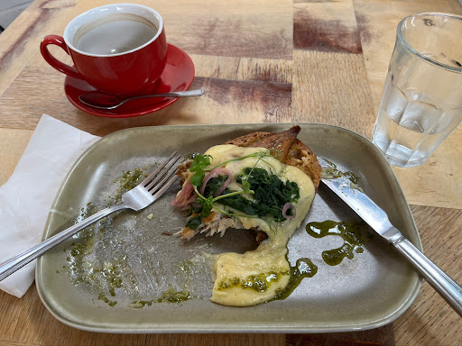 We visited Sunday late afternoon and it was packed inside. Thankfully it was sunny, so we were more than happy to sit in their back garden which has a few tables under a pink gazebo. We were served by a lovely South African lady who could not have been friendlier. Our cappuccinos arrived within minutes, enthusiastically dusted with chocolate powder. They were luxuriously frothy and delicious with two shots of espresso. We then had Sam Scram which featured some of the best smoked salmon I’ve ever had, moist and flavourful and, most importantly, abundant! The scrambled eggs weren’t as fluffy or creamy as I would have liked; overcooked, coalescing into wet clumps. The bread was delicious but unevenly toasted: one corner almost burnt, the other corner on the same slice not toasted at all. Thankfully there was enough salmon to completely cover both slices. Despite the nitpicks this was a satisfying breakfast in a pleasant setting with staff who seemed happy to be there, even when rushed off their feet at peak brunch o’clock. I would definitely come back at a...