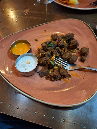 Read moreThis is a great Southern Indian style restaurant. We've been to their sister restaurant in Nottingham and always enjoyed it, but maybe because of the layout, it's not as good an atmosphere as the Leamington one. We had the beef that "Dad eats with his drinks," which was absolutely superb, and I would order that again, no problem. The blonde (on food critic reference for those that remember!) ordered the special prawn starter. A dry, but full of flavour starter. Perfect to get going. We then had a fish curry (tilapia, a white fish) which was tasty and a prawn curry which had a coconut flavour which was pur favourite. But, both were good. We wouldn't normally order fish in a standard Indian restaurant as it's often frozen and just not enough fish orders to be confident in the freshness and quality. Not at Kayal, where fish is a large part of the menu and well worth trying. Our only issue is we didn't have space to order 'from the garden' or some other meat dishes that all sounded great. Next time. Because there will be another visit soon. Service was great with a very friendly waitress who knew her stuff, was quick on the order, and helpful. And engaging with a smile. If only more could be like that! Even the manager came over to see how we were and gave us a bit of a background on the restaurant. We sat downstairs in the corner and the table was fine and the room downstairs a more relaxed atmosphere, which actually suited us. Perhaps being tucked away meant it was a little harder to ask for something from the staff, but it was no bother to stand up and walk 5 metres around the corner and ask for something. The only MINOR gripe was that the downstairs area is also where the delivery drivers wait, so behind our table was two drivers in riding gear and bags, just hanging around. Didn't do too much for the atmosphere when one left their motorbike running outside the door (which was open because it was warm). As I say, a minor gripe that didn't detract from what was a great meal. I get that delivery is an important income, so perhaps just worth thinking about options for...