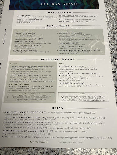 The All Day Menu starters include pan-fried scallops, chicken liver and fig parfait and sea-salt and cracked black pepper squid and mains include a wide range of choices from freshly battered line-caught cod and chips, burgers, premium cut steaks and lamb and pork dishes. The menu also offers a mouth-watering selection of Mediterranean inspired dishes including a fabulous king prawn, crab, Ortiz chorizo linguine and scallops (a personal favorite).