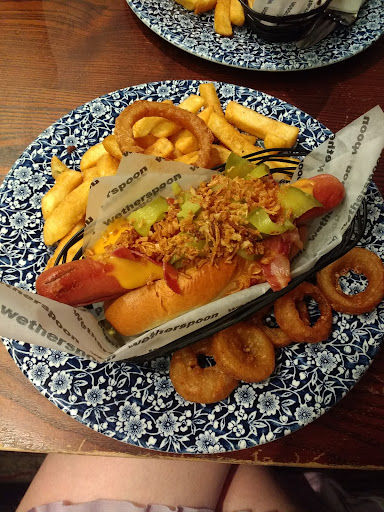 I have never left a Google review of anything before but I just wanted to let everyone know that you should definitely NOT order a State Dog if you're going on a first date or a business meeting or something because this is a BEAST. I had this last night and it is quite possibly the most logistically difficult meal I have ever had the experience of eating in any Wetherspoons EVER. "This looks amazing" I thought, and then I realised I hadn't the foggiest as to how exactly I would consume it. Well, it turns out you can pick it up in the convenient paper it is placed in, but the Monterey Jack cheese will spill out of the edges, the crispy onion will tumble all over the table, bacon will spill into your dreams, gherkins will fly from your hands. My boyfriend found this the most entertaining thing to watch, and as a result I would definitely recommend this meal for its entertainment value alone. It does taste good too as an added bonus, though. Also, the onion rings were perfect and service was great, but really, this thing should be renamed "the State Dog...