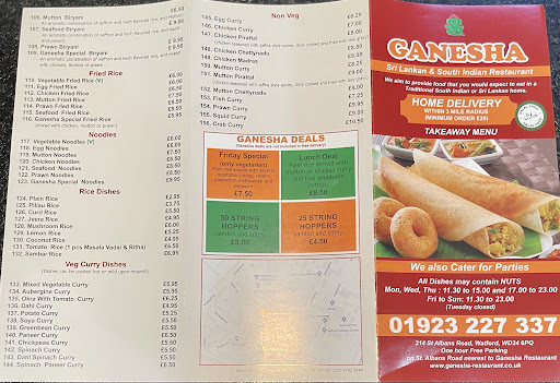 Read moreMixed review. Best dosa in Watford by far. No confusion or hassle like other dosa houses in Watford. Eaten in here before and it's cosy with friendly staff. The owner is a real gentleman. This is my second time ordering food from the Ganesha restaurant. I decided to go with the thali at £10.95 per head it's a bargain. The food was tasty but way too spicy for my wife. I like my curry on the spicy side. The portion sizes were good but too much rice for two people. They could easily substitute with another dish. The sweet vermicelli was lush, but needed more of it. The vaida was excellent too. Probably wouldn't order the thali again unless I was on my own. Like I said, I highly recommend their dosa, noodles, matar paneer, and iddly as have ordered them before and they were superb. Just be warned. If you chose spicy, you're going to get really spicy! Overall I like Ganesha restaurant and we used to eat in their many years ago. Lovely people that...
