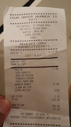 Read moreI recently visited KFC Watford on High Street, and I must say, the experience was outstanding. A huge shoutout to Sanath for his exceptional service and hospitality! From the moment I walked in, Sanath greeted me with a warm smile, and his attention to detail and professionalism were truly impressive. He went above and beyond to make sure my experience was perfect, ensuring everything I needed was taken care of promptly and with care.