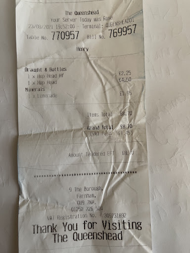 The Queen’s Head is my favourite pub in Farnham. As with all Fullers pubs, nice place, the beer is kept well, and it has a great atmosphere. However, after this experience, I’m not sure I’ll be visiting the Queens Head again soon after the ripping off approach to its customers. All such a shame as it only concerns a few pounds but you don’t really want to be having to ask for a receipt to check you’ve not been ripped off when you...