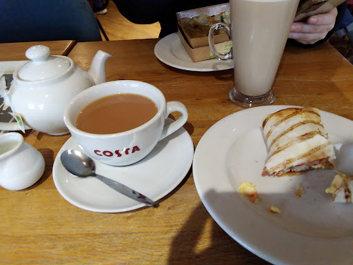 Read moreThe service is good but when l tested one of the Staff and asked what an Americano was he smirked before he told me! One problem when busy is that customers waiting for their orders have nowhere to stand except in the way of everyone moving around, but that's just bad design. The last 3 times l have been in l have noticed the low window ledges are really grubby and also the edge of the floors have crumbs and food etc, which means if you hang a long jacket or raincoat on the back of your chair, you are liable to go out with more than you came in with! So, all the things you would normally expect from Costa with a few add ons. If they haven't cleaned up by next time l will spend my coffee money with the...