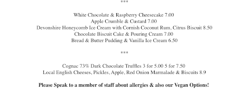 Having looked at the menu on-line which reads âPlease Speak to a member of staff about allergies & also our Vegan Options!â, we had asked about these and was told that someone would be along in a minute. I asked shortly after if it were table service for drinks or should I go to the bar and was told it was table service and someone would come and take our order.