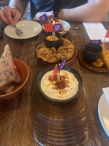 I'm not a huge fan of places that have the low light ambience during the day, but I know it's the thing these days, although I did almost have to use my phone torch in the toilets as it was so dark, must save loads on electric! Followed the sign rules that asked to wait to be seated. Waitress came to us asking if there were any allergy requirements to which we said no...she then walked off, chatting to customers at another table as she passed and then never directed us to our own table and went back to the bar (after saying to order at bar or use the app). Don't really understand why we had to wait to be seated when we weren't actually seated and it's not table service. Positives...Food was very tasty when it came and was quick. Staff friendly. My husband ordered the Philly Cheese Ciabata with beef brisket for £9.95. It was very flavoursome, but we were massively underwhelmed by.the fact that there was absolutely no salad garnish, tiny or otherwise or even a handful of cheap crisps...just the toasted Ciabata sandwich on a very small plate. Really wish I'd taken a photo to show how an almost £10 Ciabata Sandwich had been presented. It honesty looked so basic, which is probably why I didn't bother to take a picture. Food presentation and colour is an absolute must, part of a great dining experience is all about the look, smell and taste. A small colourful side salad hardly breaks the profit budget. To be fair, the menu doesn't state any side garnish. The choice of foods for people with intolerances was very varied though and therefore good for anyone who is coeliac etc. May try here again, but won't rush as my husbands light bite was not value for money in my opinion (and I work in a...
