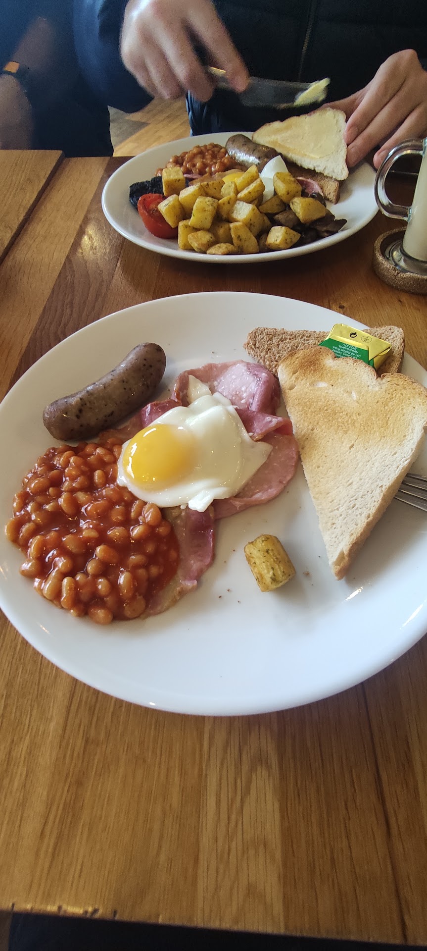 Read moreUnfortunately not the best full English breakfast, 1 egg 1 Sausage, 2 bacon, mushrooms and Tom's, ½ slice white toast and ½ slice brown toast and you have to pay extra for black pudding (95p) For £9.95 not great Also I'm not a fan of Tom's or mushrooms they didn't do substitutes which is a shame. Also had a runny white even after asking for it to be cooked on both sides. Nice location though just shame about the food. (The one Herby potato in the photo was one my friends that was a £1.95...