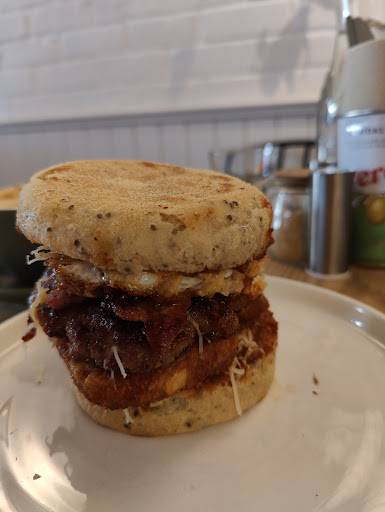 I had the "Frank" which was a breakfast served in an English muffin. Not something you can eat like a burger unless you have a detachable jaw because it was filled with a full fry - egg, bacon, sausage patty and hash browns, plus some caramelised onions and some cheese thrown in for good measure, topped off with a tangy barbeque sauce.