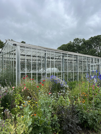 We made the most of the suggestion to explore the gardens and there appeared to be no limitations to this. There are a number of huge greenhouses bursting with tomato plants, vines and other veg. These are interspersed with combined vegetable and flower beds and fruit trees. We found chickens, geese and turkeys but must have missed the pigs. On our way we came across friendly gardeners and Stacey Gledhill, the artist in residence for the summer. To be clear these are not manicured gardens, they are beautifully wild and at this time of year watering and harvesting might understandably take priority over weeding or meticulous tidying up.