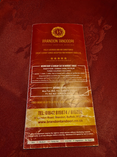 Read moreI had a delivery from here last night. The prawn cocktail was really nice, fresh prawns and lettuce, very tasty. I also ordered Lamb Kosundi, mushroom rice and keema naan. The rice tasted a bit stewed and over done, but may just not like mushroom rice and happy to try other rice in future. At first I wasn’t really enjoying the dish as I felt the tomato flavour was really strong, however after a while when the spices kicked in I was really enjoying the combination of perfectly synced spices with the dish. The keema meat in the naan bread was lop sided (as it’s been for a long time at this restaurant, i.e. most of the meat in one side of the naan.) The naan bread was very nice though, soft and doughy. I’ve recently eaten at other delivery food places in Brandon and believe this is the best food place in Brandon. The order was on time and the driver was friendly with good customer service. I consider this a traditional Indian restaurant. After spending time in Bury St Edmunds going to an Indian restaurant there I think it would be good for the Brandon Tandoori to have more things on the menu, I really like Chicken Chettinad as an example. I will order from here again, but I would like to see an option for smaller portions as the dishes are too much for one person. I consider this restaurant very good...