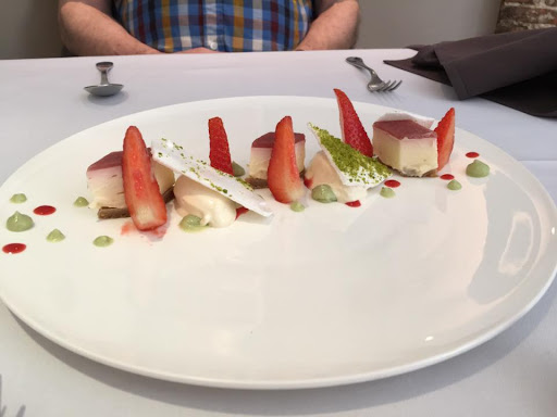 Today, after an enforced gap of over four years we returned to La Maison Bleue in Bury St Edmunds. Some 20 years ago we first visited it, observing a slight whiff of fresh paint at the time. In all that time it has never let us down for a moment. And today no exception. It is the restaurant I have visited most in my life and it rates as the best on all reasonable tests. Not the dearest (Three Chimneys Isle of Skye) and not the most exalted (any number of TV chef emporiums). Just the best. It is French by style and management - and by service. Good food may start in the kitchen and end on the plate but it takes a lot more to make for a fine dining experience. And it's not even about what you order - it is what comes with it by Chef's decision and the staff's willingness to cossett and care for their customers. La Maison does that non pareil. . Today we had the luncheon menu as so often. I went fish and fish (as so often) and Janet fowl and fish. But we started with an amuse bouche of lettuce gazpacho with Mascarpone cheese and other delights - sensational and a great palate wakener. Janet's carpaccio of marinated and finely shaved Guinea fowl was amazing; my lightly sizzled swordfish cubes were dressed in ways I would need to read the menu for. We both opted for Hake - not a fish to order in an English resto - but here trimmed to perfection, cooked with a light touch, assembled with delicious-ness. If I mention a touch of real caviar on the plate you will get the feel of the Chef's touch. A bowl of what would be called chips but were in reality sauteed tiny, unskinned crescents of joyous spuds completed our selection. Elsewhere we regretted the bread decision as bowls of sensational breads were delivered and devoured - and even commented on! This was eased along with a carafe of the house white Gascony - I have been ordering this for 20 years and its is the most sensation lunchtime white; easily matching my favoured Sauv B (Sancerre or Hayshed by pref). But we reserved the camera for Janet's dessert of strawberries... well they were the basis. And the cream was actually mascarpone ice cream to die for. Not done yet we ordered, with confidence espressos (mine brillient, J's slightly watery - odd) but these came with another amuse bouche - one astonishing pastille, one amazing salted caramel cube and an eye glass of something orangey and creamy and - to die for. OK the bill was £70 excluding service but frankly it was a snip....