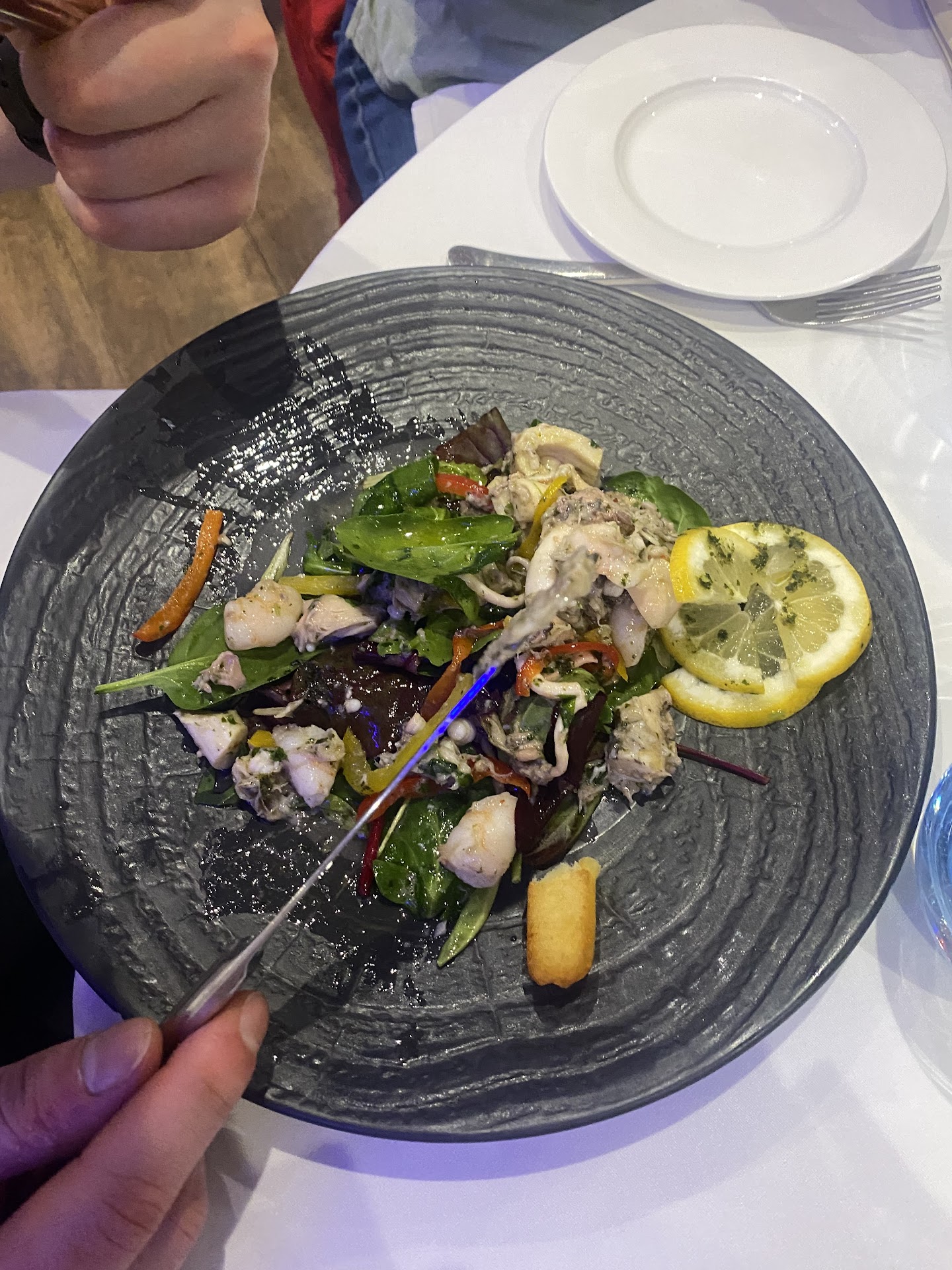 Read moreWe went here twice. At first time starter mix of seafood salad was soo fresh and delicious, something tomatoey on toast was also delicious. On the main menu steak was brilliant, baby cow meat totally waste of money. It comes huge looking coated batter piece, and then you slice it to eat there is nothing in there, you slice more and more and finally you find hair thing like meat in there. If taste was delicious it could be tolerable but taste wasnt also good. Also we had raviolle it was good, it comes 4 piece for £16. I loved the taste, it was beetrooty flaovur, It looks so small but at the end of 4 piece I can of had enough.