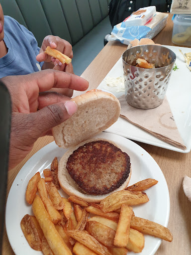 *Disclaimer* went during a very busy period, weekend and during half term holiday. Restaurant was packed, which was expected, didn't take long to get a table luckily but I'd try and go just before or after the lunch rush to ensure you're not stuck waiting outside as many were that day Ordering was only via QR code, and the system isn't great to use, had to keep going back and forth between all the tabs - very annoying. The menu isn't big but appreciate the variety of cuisines, things like Thai meatballs, vegan options, wings etc. Not many items were available when we visited which was disappointing. Ordered some coffees, carrot cakes, chips and their chargrilled burger. I was extremely disappointed in the burger, it was barely seasoned ans extremely dry. Considering the price, I expected much better. The carrot cakes I'm told were nice, and staff were quite friendly too, but I suggest packing your own lunches or finding all the restaurants in advance to find one best suited to your tastes.