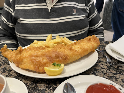 Read moreVisited Whitby before, can not go without having Fish & Chips and decided to dine-in based on reviews as would normally opt for The Magpie. OK, so it’s not the real seaside experience eating in a restaurant, missing out on the sea air, dodging the gulls and protecting your dinner from the scavengers on the sea front, however Trenchers was a great experience. The service was excellent, loads of immaculately presented staff, seated immediately in a clean and comfy area, drinks arrived in a flash and food order taken promptly. Travelling as a couple I had Regular Haddock and my Partner had Small Cod. Mains arrived after a short wait, on the face of it, the Cod looked very small in comparison to the Haddock, but don’t be deceived, it was more than sufficient and my partner struggled to finish as the chips were plentiful. The batter on the fish was exceptional, aerated and crunchy with shards of delicious flavour crumbing off. Both fish were chunky, flaky and beautiful cooked, tender whist retaining its bite. I think the Haddock had a stronger flavour owing to the skin being left on. Chips were well cut and cooked to perfection, light golden colour with a crisp edge, fluffy on the inside. At no point during the meal did either the fish of chips go soggy, despite freshly squeezed lemon and copious amounts of vinegar, clearly the temperature of the oil has something to do with that, like I say, perfection. We were provided with homemade tartar sauce, which was a great addition, I ordered mushy peas, unfortunately I felt they were a little on the bland side, nothing a bit of vinegar and a spoon of tartar sauce couldn’t fix, however a little on the expensive side too. To be honest, the whole restaurant is on the expensive side compared to the nearby competition. It is certainly the most expensive we saw personally, not saying it is the most expensive as we didn’t look everywhere. However, as with most things in life you generally get what you pay for and Trenchers was definitely worth paying that bit extra for. Excellent service, top quality fresh fish caught daily and locally farmed potatoes cooked to perfection. Highly recommended, a must visit if...