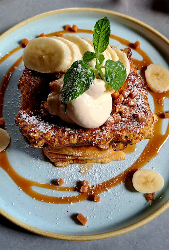 What we got: Banoffee & Fudge French Toast: Brioche French Toast, Served With Vanilla Mascarpone, Banana, Fudge Chunks, Finished With A Drizzle Of Toffee Sauce