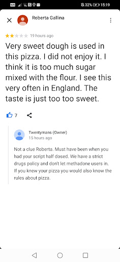 I'm a Pizza expert having eaten them in Venice, Rome, Naples,.... and ALL over Italy - I love pizza 😍😍😍 I ordered a ham and mushroom pizza, cheesy garlic bread and cheesecake from 'Twentymans' and,.................... it was scrumptious 😋 😛😛 I mean to say amazingly good - the dough, cheese, sauce and all the other ingredients were all TOP drawer, being high quality and perfectly sourced. I actually thought it was as good as one I recently ate in Naples which, as all true officianados will know, is the 'home' of Pizza. It honestly was better than any pizza I've eaten in England 🇬🇧 🇬🇧 😋 I chatted with the owner, Andrew, and found him to be delightful, witty company. What he's done here is quite fantastic,....... he's transported a little slice of Italy into Bradshawgate, Leigh and imo he deserves our respect and support for this. All his staff were very nice and polite too 🤩🤩🤩 The cheesecake was rich and exquisite and the perfect finish 🤑🤑🥰 The wine was delicious and the restaurant had a nice, chilled ambiance 🥳🥳🥳😎😎😎❤❤❤ I'm gonna become a...