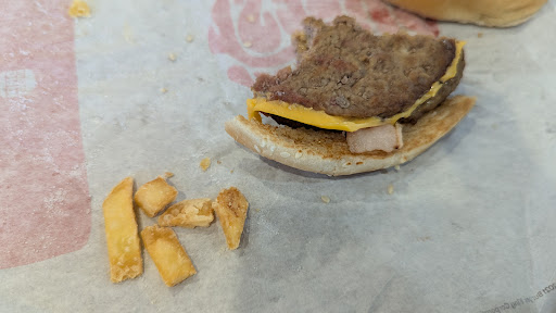 Read moreBefore I ordered, I saw there wasn't any burgers ready to serve. I usually see a couple of the more popular burgers at the ready. I ordered and sat down and my order was ready, already! Then I saw the pale fatty goop of the partially cooked bacon and my anaemic burger that clearly had never seen a flame. The chips were obviously the dregs with plenty of tiny pieces. The food looked nothing like the menu picture. I ordered two double bacon and cheese burger meals as they were on offer for £15 to eat in. I was handed a very small bag that contained both meals, two drinks and no tray. They obviously don't want to clean trays so you just have to struggle. Terrible value at £15, quick but at the cost of quality. Not what I expected at a fast food franchise. The chairs and tables were grotty, and I never noticed any cleaning during our stay for over...