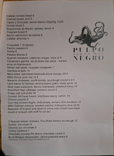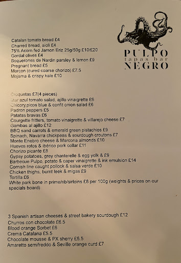 Read moreNot a place for couples wanting a romantic, quiet or reasonably priced evening. Went to this restaurant last night (26th Feb 22). Despite booking 3 weeks in advance for a table for 2, we were only given the choice of 2 tables. One too cramped to sit at or a âwall facingâ table with stools. As the stools had more space we went there. Big mistake as we had to sit side by side staring at a darkly painted wall just 2 feet away. The kitchen was just 10 feet away and very noisy. The head waitress was pleasant enough but was on us too quickly wanting us to order because it was busy (6pm). Then there was the menu. Main tapas list contained 11 vegetable dishes, 3 seafood and 4 meat dishes. ÂŁ12 for 5 prawns, ÂŁ14 for just one octopus (pulpo) leg (just 3 inches long). All dishes standard tapas size but very expensive to my mind. Other than the head waitress who had some training, the other staff were untrained. They would just reach over you without saying excuse me and twice nearly bumped hot food on my shoulder or face. I had just 2 soft drinks, my wife had 2 glasses of wine in a carafe. We couldnât have any churros for desert because theyâd run out already (and our table was at 6pm, so not late). Surrounding us were many tables for 4 with children (they were most disappointed that the chocolate churros had run out). I suspect many parents go there just to give their children that delicacy. We left after having no starters and just 6 small tapas plates between us. The bill was ÂŁ98 (shocker). I left there hungry, disappointed and depressed from staring at a dark wall. Iâm sure itâs better at lunchtime in the daylight by a window but at the price it is, Iâd only go back if I was in a group of 4 or more to get a...