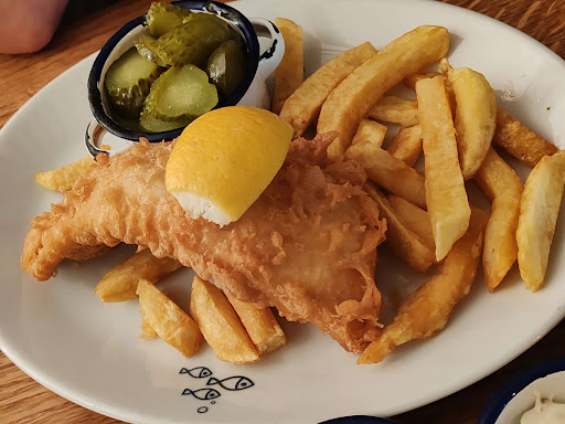 Read moreLook the food was pretty nice. fish was crunchy and good gently greesy chips with the tasty standard sauces and the staff were also nice and polite. Only issue was they did have this "unlimted chips" thing on the menu and I know it seems petty but if they are going to advertise that I expect a troublingly large amount of chips and to be bombarded with more chips till I have to pray for salvation from the wave of chips. Alas no. they game me a tiny handful with my fish which meant I immediatly had to ask for more and then I had to badger them endlessly to get it. In the end I got two moderate sized exta bowls for me and my other half which meant we had a normal chip shop portion each. but it took 20 minutes after asking for them to bring the first one, the last bowl came out in resonable time (manged to snag them when they were trying to clear up) but that was the last one I coudl get as they closed the kitchen without warning us . Then to add insult to injury they tried to charge me for extra chips. Look I don't mind not having unlimited chips if that's not what you want to offer, fine, take it off the menu. honestly I don't really want unlimted chips, I am fat enough as I am. but if you do promise it then I expect them to appear. For further reference look up homers visit to the...