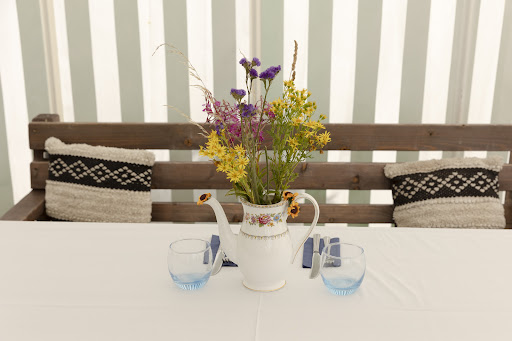 The decorations matched the day's vibes perfectly, from the handwritten chalk signs, to the board of the brides' baby photos, and the delicate wildflowers that Imogen picked herself on the wedding morning. There was plenty of space for guests to mill about in the private events area as well as climbing frames for the kids to enjoy.