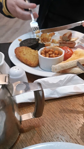 Top quality ingredients bacon tasted like back back should I never noticed and fat on it sausage was tasty no of those herb just a decent pork sausage again not fat or gristle. I would have preferred a tinned tomato but it wasn't a big deal. Good pot of twinings English tea and a little pot of milk.