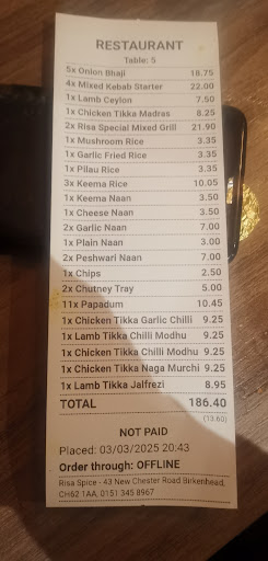 Read moreAs part of a local curry club we tried the risa spice tonight as its local for the 9 of us. On arrival we were shown to our table promptly but waited for over 15 minutes for someone to give us a menu. We chose starters and mains and the usual poppodums. After a while the starters arrived one of our party had to wait for his bhajis as they had forgotton them. All the starters were very nice however. Then the mains came of different dishes. They forgot one main meal so the person had to wait and one had to wait for chips. He had ate his curry by then so the chios were left. We had heard great things about this restaurant and in a nutshell the food was acceptable but although the staff were friendly and polite the service was a little poor. We would go back but its not a...