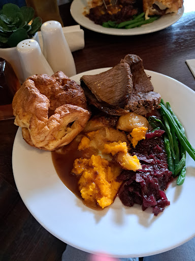 Had received a voucher for a presant.. Went with my wife brother and his wife for Sunday lunch.. Booked a table as we thought it would be very busy.. We arrived and a very attentive young man showed us to our table.. We could have chosen anyone.. As only one other table was occupied. We where offered 2 menus unfortunately there where many starters off so we went straight on to mains.. The roast beef was delicious as was the pea and mushroom tagatelli the bun on the house burger was burnt as was the added bacon.. It would have been a 4 star at this stage... Desserts again a few off... raspberry roulade so they offered a strawberry Eaton mess 3 came looking very like angel delight with a chopped up strawberry on top disappointing. The cheeseboard platter came with no blue cheese on or grapes as advertised and butter on the crackers. When asked for the Shropshire blue my wife was offered blue cheese boms .... Not something we would even try again... Meanwhile during the main one of our party needed to use the accessible toilets had to wait while an able bodied member of staff.. Was using it.. Meaning there main was cold by the time they got back... We where not offered any reduction on our bill even though we where charged for desserts and cheeseboard we never received... A very expensive lunch for four even with our £50 presant .....