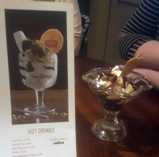 We visited Toby Calvery Arrow Park for the first time last Sunday (2019), where do I begin, on arrival staff mention that we only have the table for 90 minuets and then I presume we will be asked to leave, after queing for food, we were rushed through (no manners displayed) and I was shocked to only recieve one and a half slices of turkey, I must mention that I was really impressed with the servers carving skills, I did not know meat could be sliced so thin, the gentleman next to me received the same short change as I did and he asked if he could have a very small crispy overdone piece of beef end, that I would say nobody else would want, the sever (your member of staff) told him he could have it but the server would need to remove some meat from his plate first, I was absolutely shocked at the lack of customer care, then we ordered some deserts from the menu ( see attached photo) talk about the misdiscription of goods act, as you can see we recieved a childs dish in place of what was advertised, a third of the size of the one on the Toby menu, when you are spending £80 on carveries you expext to recieve what is advertised, to be fair the standard of food is very good and the waitress at our table was very good indeed and for that I would have given 4 Stars, in line with other Toby Calverys. I have visited many Toby Calvery's over the years and never experienced this before, so I can take an educated guess that the appalling treatment we recieved and witnessed was down to the management of this Toby Calvery, if you are happy with just passing trade then carry on treating customers this way, if you want customers to return then you need to do a little better than this.