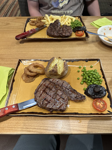 P**s poor service and food. Myself and the wife decided to take the kids out for dinner but really wish we hadn't. On arrival they were busy but not overly busy but the amount of dirty tables and plates left on tables was not acceptable. The waiting staff on a whole were all over the place and no sign of organisation at one point the manager was working harder than his staff if you could call it working . Once we were seated we had a little wait for the waitress to come and take drinks orders after waiting for about 10 mins she popped up like the tv character Mr Benn. We placed our drink and food order then waited a further 10 mins for one pint of larger and 4 empty glasses for the refillable drinks . When my wife's and mine starter finally arrived we just knew we were in for a poor evening . My wife had ordered the loaded potato skins and it had been quite clearly deep fried but this was not mentioned on the menu and because my wife can't process oil properly I ate them the were over done and full of oil . The waitress came out with a lame excuse that mine was being redone as the manager wasn't impressed with what he saw so I waited a further 10 to 15 mins for my starter which was the pineapple and halloumi skewers . The pineapple was hard and halloumi was cold and as for the spiked maple syrup was utterly horrible it actually looks like something my cat had brought up . As for the mains the club 83 which was mine the meat was stone cold ( chicken and ribs ) I asked to change my chips to the sage and onion fries I was told by the waitress it already came with them but it didn't the meat is obviously cooked earlier in the day and reheated my wife had the simply chicken with baked potato and steamed veg . Well the potato was covered in butter / oil poss deep fried again her steam veg wasn't steamed veg looked more like Tescos value frozen veg and was hard cold and flavour less . Thankfully the children's meal were ok ish . But with that said my daughter's plate on the underside was covered in dry sauce so you can see it hasn't been cleaned properly . I would have brought this to the waitresses attention but once the food was brought over that was the last we saw of her no one came to see how we were or how the food was . In our opinion the most enjoyable part of the night was the salad cart . Save your hard earned cash and stick with nandos or push the boat out and go to MacDonald will never visit again it was so much better in the late 90s . With food served like this with piss poor service it's no wonder so...