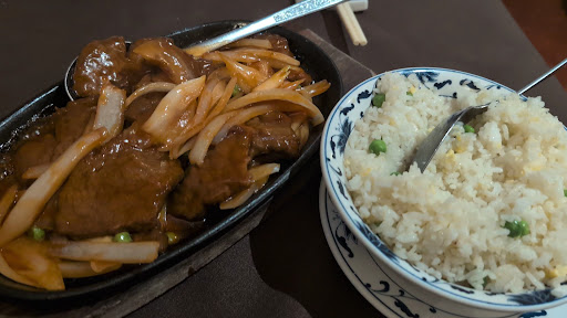 We had roast pork dumplings to start, they were delicious, favourite starter for me. I had sizzling beef and my partner had chilli and coriander prawns. Both nicely seasoned. The beef had a lovely sauce with onions and peas. My partner had a nice red onion salad with his prawns, which was nice I had a bit. I like red onions better that white..
