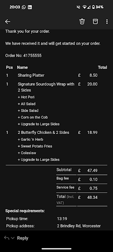 Ordered food for collection as we do regularly. When we arrived home realised that more than half of the items weâd ordered werenât in the bag and we had half of someone elseâs order. Not that this happens regularly here but it was particularly inconvenient today because weâre going on a night shift. Rang back and said what was missing and we went back to collect it.