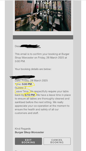 After spending ÂŁ60 in the burger shop between 2 people I felt like they had got our money and were ushering us out the door so they could squeeze more people in and drain more money from them. An 1hour 15mins Isnât long enough for a table allocation the restaurant needs to urgently review this as they have lost a customer in both myself and freind as we wonât...