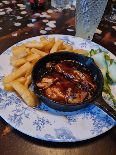Read moreWaited 10 minutes to be seated despite having booked. Could see the staff were really busy, so not the end of the world. Korean bbq chicken strips and cheesy garlic bread starters were excellent - lovely flavour and generous portions. I had bullet proof steak pie for main - so overcooked I literally couldn't break into it. It was accompanied with a flat scoop of grayish mash, peas & carrots - got lots of gravy though! Sent it back and got an undercooked pie with a raw bottom and very scant filling as an unenviable replacement! Couldn't ba arsed to complain again as hubby had virtually finished his overcooked hunter's chicken by then. His chips were good though. Tried the mini pud and drink (triple choc brownie and coffee option) for dessert - I got told I had to pay 99p extra for icecream (more if I wanted the clotted ice cream that was part of the proper size pud). Out came a 2 inch by 1 inch piece of brownie, no chocolate sauce, and the tiniest, eeny weeny spoonful of vanilla ice cream, presented in one of those mini little sauce bowls that normally hold a blob of ketchup. Two mouthfuls at best!! I'd love to know what size the full price triple chocolate brownie, chocolate sauce and clotted icecream is. Latte was lukewarm - cost me £6.58 - had to laugh otherwise I might have been rude. No suggestion of a reduction due to having to send a meal back and then eating our mains at different times. Lovely looking pub, with plenty of guests - menu looked good, but beyond the starter, my main was badly cooked (twice), and my mini pud was minuscule. Very, very...